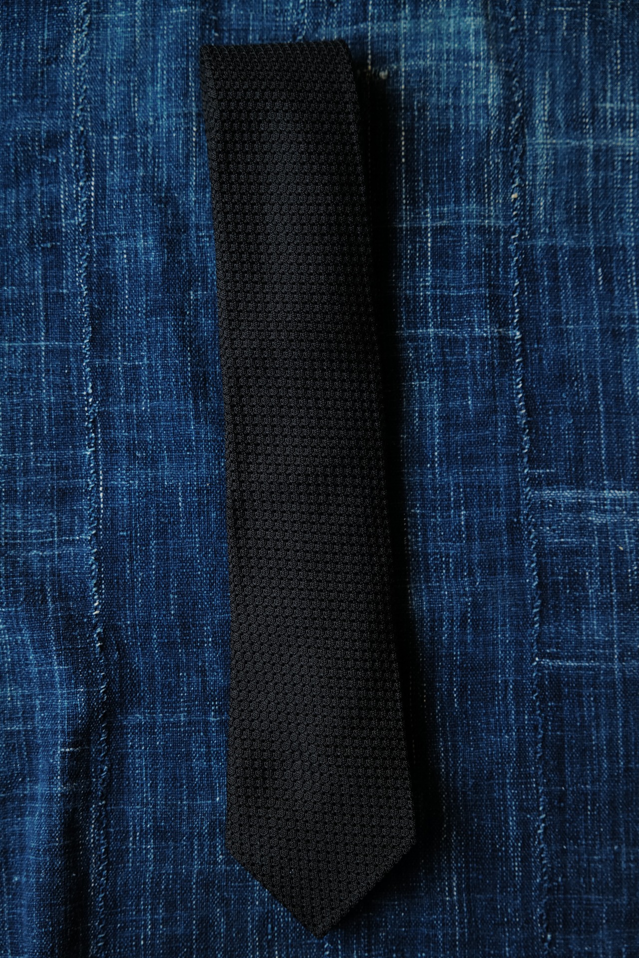 こちらはイタリアで最も古い絹織物工房フェルモ・フォサッティで織られた、ダークネイビーソリッドのフレスコ生地。旧式の織機でシルク糸を捻りながら織ったこちらの生地は、豊かな凹凸感が特徴です。そんな生地の魅力を活かすために、このネクタイは裏地を使わず仕立て、熟練の職人さんが三角の縁を仕上げた、素晴らしいクオリティの1本です。